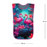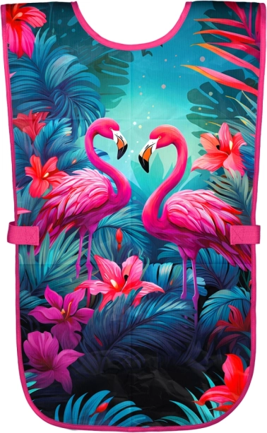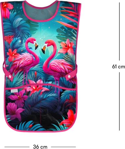 Practicile două buzunare în partea de jos pot găzdui pensule, creioane și mici accesorii, în timp ce bretelele ajustabile asigură o potrivire bună pentru copii de vârste diferite. Motivul stilat cu flamingi și elemente tropicale va încânta orice mic creator.