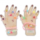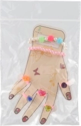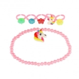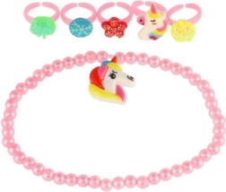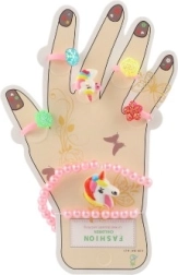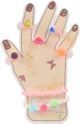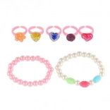 Acest set fermecător de accesorii aduce copiilor bucuria culorilor și a fanteziei. Inelele din plastic cu motive de inimioare, floricele sau pietricele sclipitoare și brățările elastice se pun ușor și sunt plăcute la purtare. Se potrivesc perfect pentru deghizări, colțuri de joacă sau ca mic cadou.