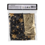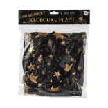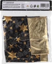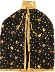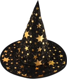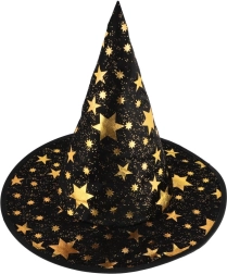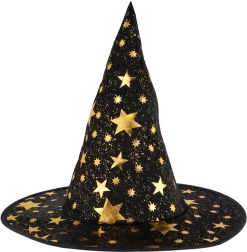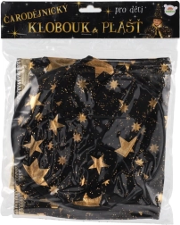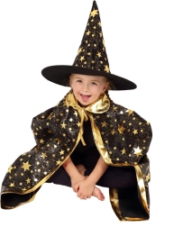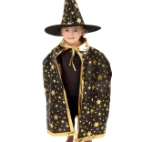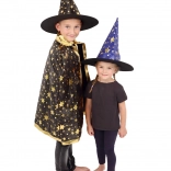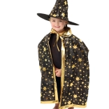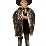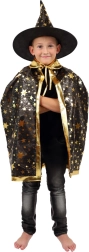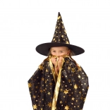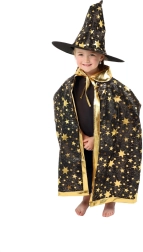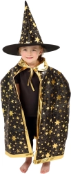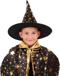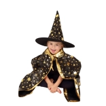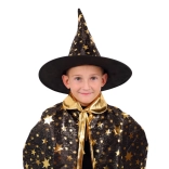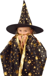 Transformă-ți copilul într-un mic magician. Acest set negru‑auriu cu imprimeu de stele include o pălărie vrăjitorească remarcabilă și o pelerină asortată, ideale pentru carnavaluri pentru copii, baluri mascate și petreceri de Halloween. Datorită materialelor ușoare, se poartă cu ușurință și permit libertate de mișcare în timpul jocurilor și reprezentațiilor.