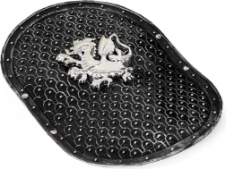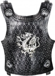 Designul impresionant cu simboluri de dragon pe armură și scut va captiva orice mic cavaler.