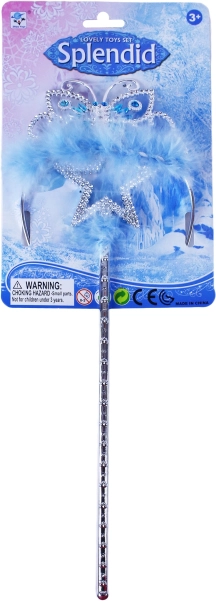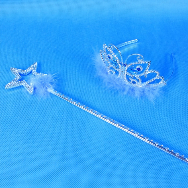 Acest set exclusiv oferă tot ceea ce are nevoie o mică prințesă pentru aventurile sale magice. Include o tiară argintie decorată cu pietricele albastre și o baghetă elegantă. Ambele elemente sunt împodobite cu pene albastre delicate, care adaugă frumusețe și farmec. Ideal pentru joaca de-a prințese, petreceri costumate și alte activități creative.