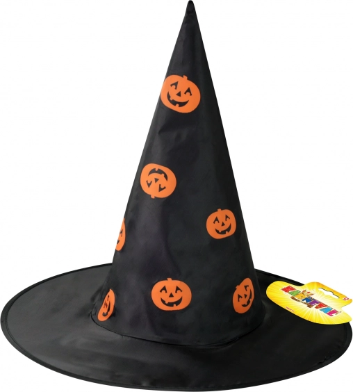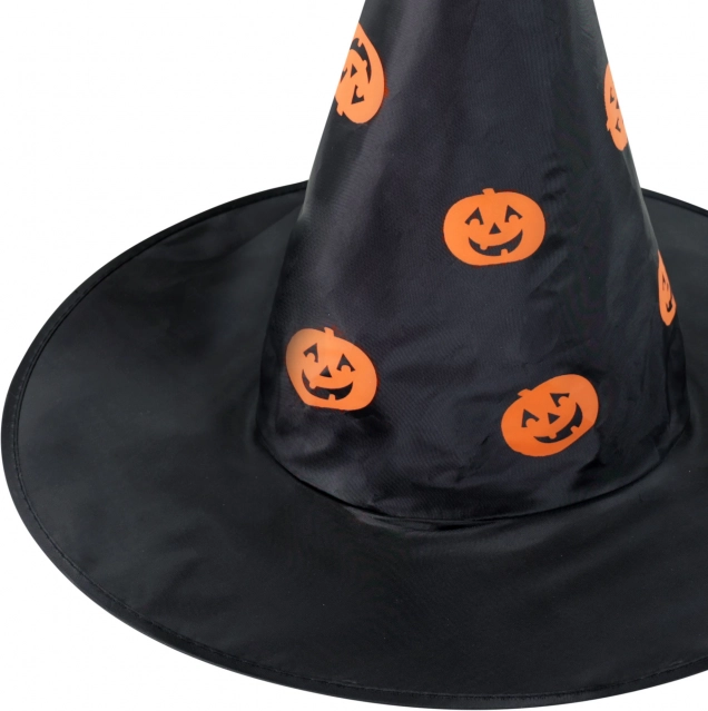 Pălărie vrăjitorească stilată pentru copii, de culoare neagră, cu imprimeu de dovleci portocalii, pentru un costum de Halloween perfect. Ideală pentru carnaval, petreceri și evenimente tematice. Oferă purtare confortabilă și un aspect de impact pentru micii magicieni și vrăjitoare. Halloween, pălărie de vrăjitoare, dovleci, costum pentru copii.
