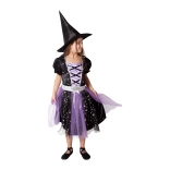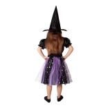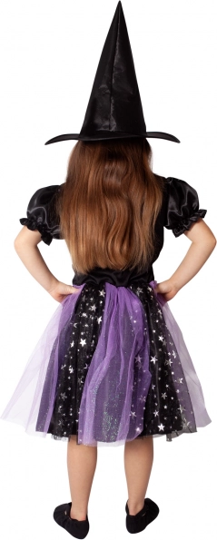 Acest costum încântător de vrăjitoare va bucura toate micile iubitoare de magie. Combină negrul elegant cu movul fermecat, stelele sclipitoare și tullul ușor pentru un look cu adevărat magic. Pălăria ascuțită se potrivește cu rochia și finalizează ținuta completă pentru carnaval, Halloween sau serbările școlare.