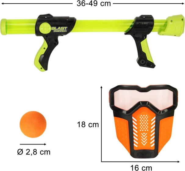 Muniția moale din spumă este blândă, iar perechea de măști de protecție sporește siguranța și confortul în timpul jocului. Blasterele funcționează fără baterii – lovitura se produce prin glisarea părții din spate a țevii, astfel că jocul e mereu gata, oriunde v-ați afla.