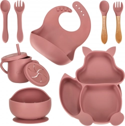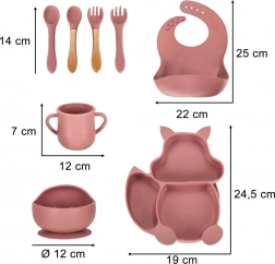 Toate piesele sunt perfect adaptate mâinilor mici și au margini netede, ideale pentru învățarea alimentației independente. Baveta din silicon previne murdărirea hainelor și colectează firimiturile. Siliconul este ușor de întreținut – poate fi spălat cu apă și detergent sau în mașina de spălat vase.