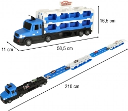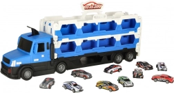 Camionul oferă distracție dublă: ca transportor auto aduce mașinuțele la locul cursei, iar printr-o singură mișcare se transformă într-o pistă de curse de 210 cm. Lansatorul integrat trimite vehiculele pe pistă cu viteza fulgerului, în timp ce efectele luminoase și sonore oferă curselor o atmosferă realistă. Construcția din plastic rezistent este ideală pentru joaca de zi cu zi.