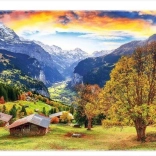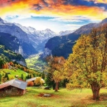 Scenă a unei văi alpine cu căsuțe, copaci de toamnă și creste înzăpezite, evidențiată de culori bogate și detalii fine – ideală pentru înrămare după asamblare.