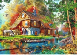 Descoperă farmecul vieții la țară cu puzzle-ul care, după asamblare, formează o imagine de 480 × 340 mm. Ilustrația lui Dominic Davison surprinde o căsuță idilică lângă un pârâu liniștit, înconjurată de natură – un motiv ideal pentru momente de relaxare și concentrare.