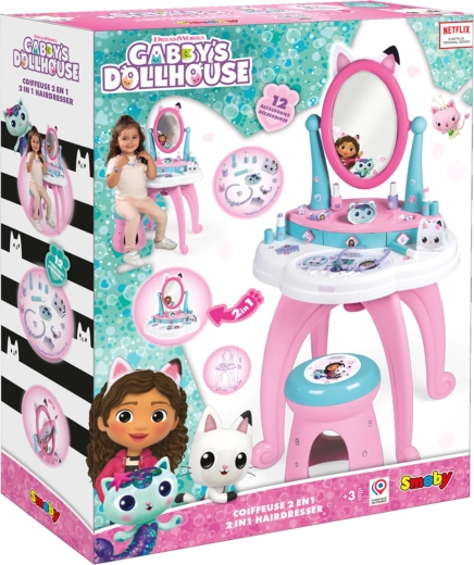 Intrați în lumea magică GABBY’S DOLLHOUSE cu măsuța de toaletă pentru copii 3 în 1 de la Smoby. Oferă uscarea părului, machiaj și îngrijirea unghiilor, are o oglindă mare, reglabilă, 3 sertare și un taburet confortabil. În pachet se află 12 accesorii pentru joc creativ și dezvoltarea imaginației.