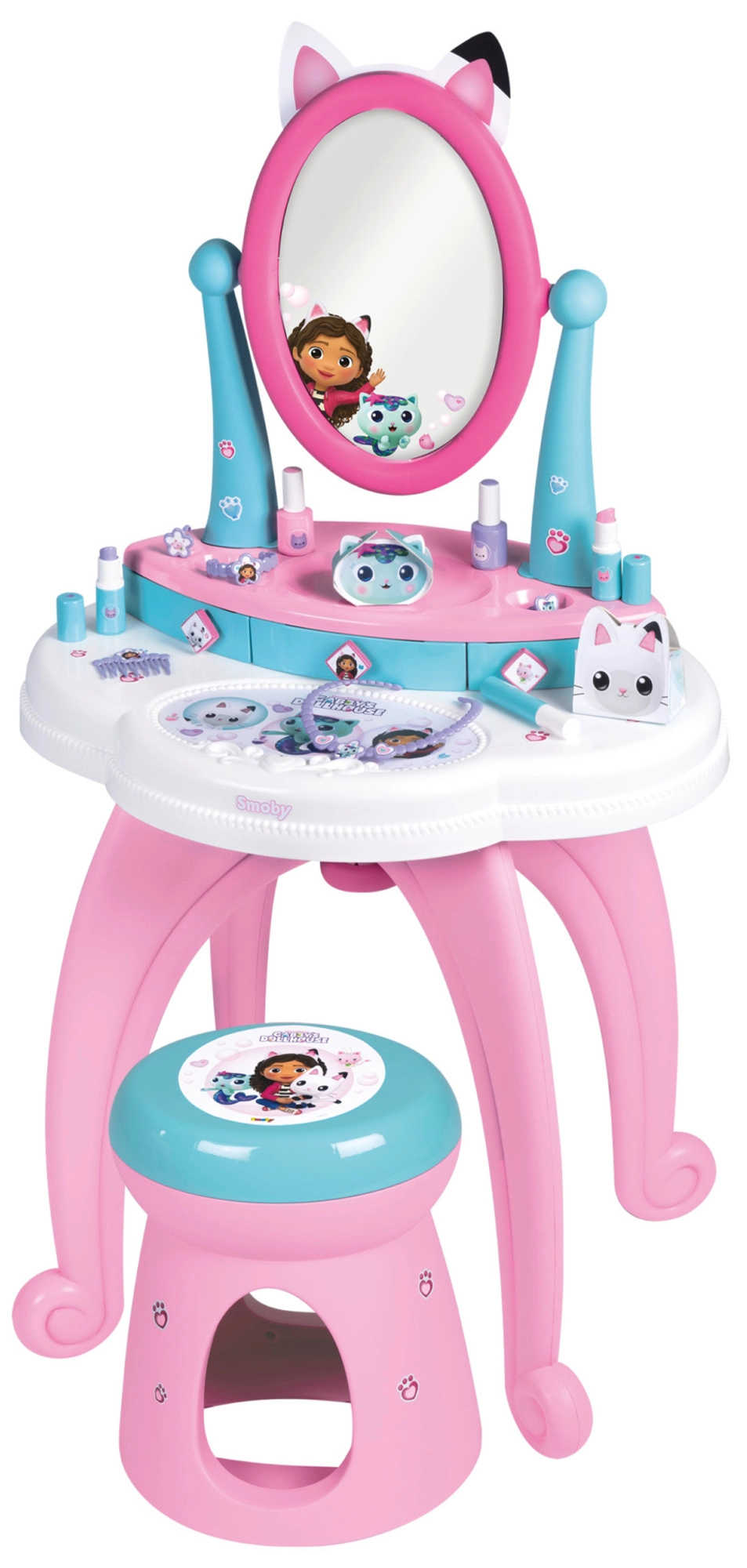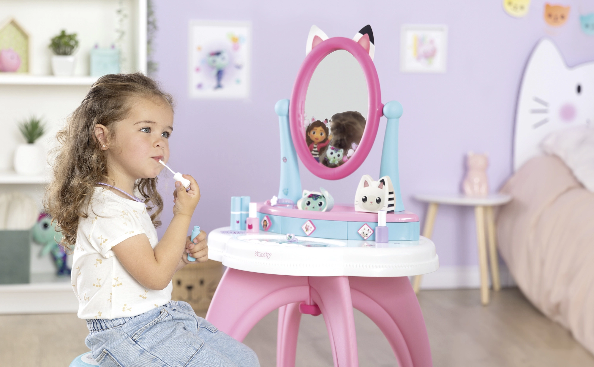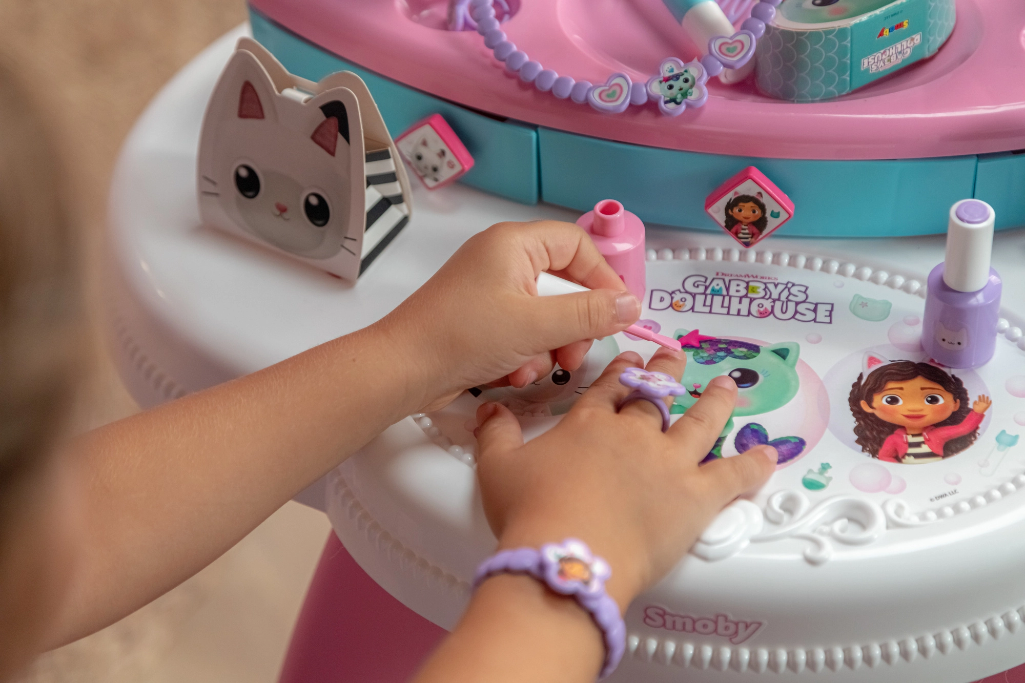 Măsuța de toaletă pentru copii inspirată de serialul îndrăgit GABBY’S DOLLHOUSE transformă camera într-un mic studio de frumusețe. Datorită oglinzii mari, ajustabile, celor trei sertare și setului bogat de accesorii, totul este la îndemână, iar jocul este realist și sigur.