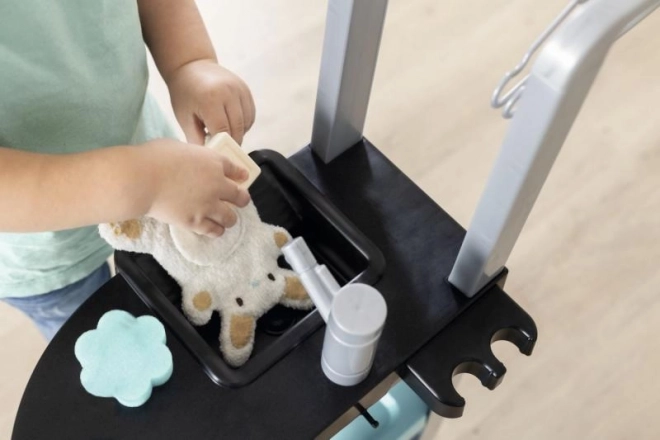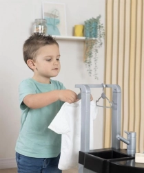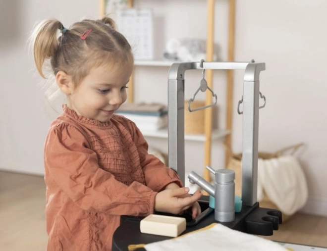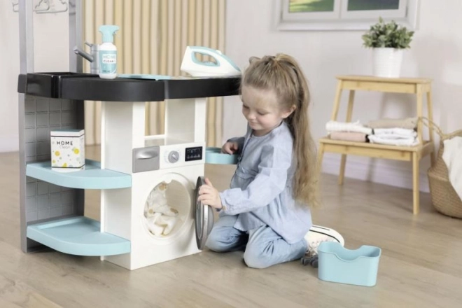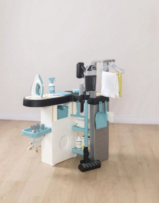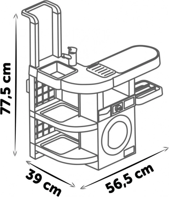 Copiii pot folosi patru părți diferite: mașină de spălat, chiuvetă, zonă de uscare și masa de călcat. Fiecare parte este proiectată pentru a crea situații de joc autentice.