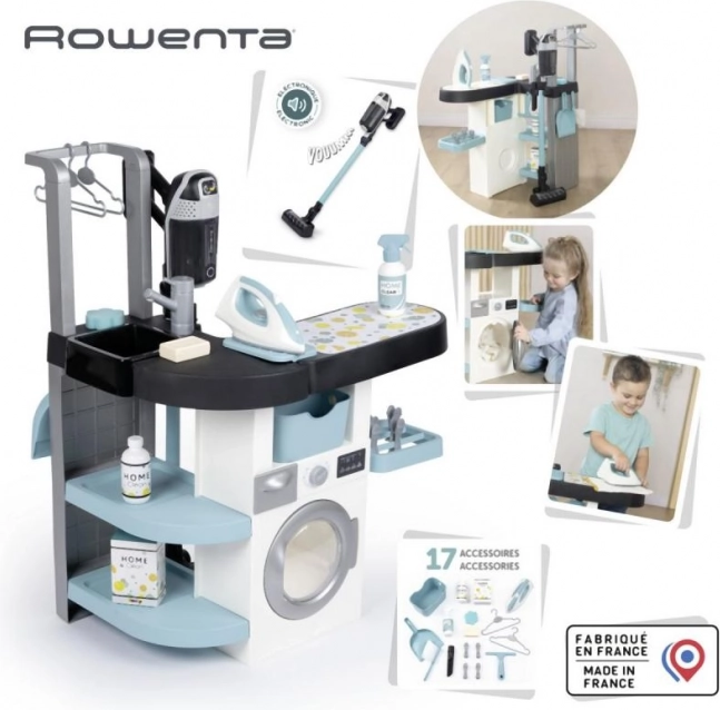 Spălătoria pentru copii cu fier de călcat și aspirator Rowenta este alegerea perfectă pentru micii ajutători ai casei. Include patru părți de joc: mașină de spălat, chiuvetă pentru spălare manuală, zonă de uscare și masă de călcat, care îi învață pe copii despre sarcinile casnice.