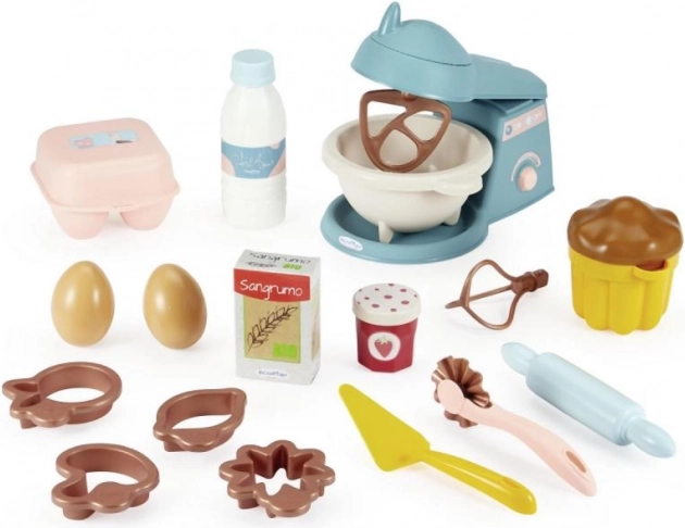 - Mixer cu 2 accesorii interschimbabile, formă pentru copt, decupatoare, sucitor, role tăietoare, ouă și alte alimente de jucărie