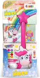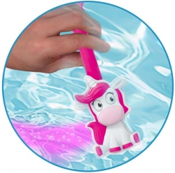 Introdu picătura efervescentă în unicorn și scufundă bagheta în apă – din baghetă se creează o urmă clară și colorată, care transformă baia într-o experiență magică.
