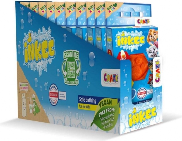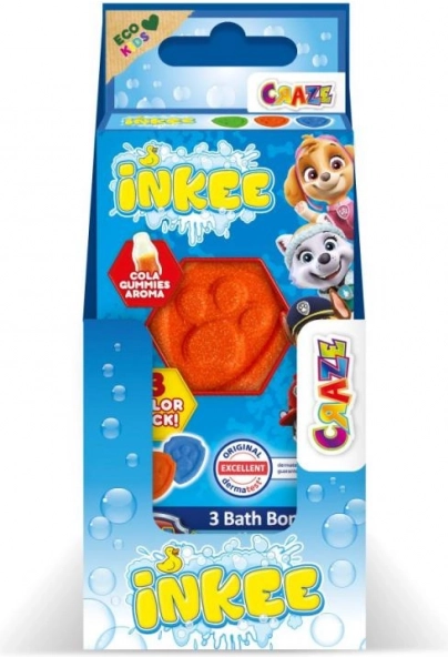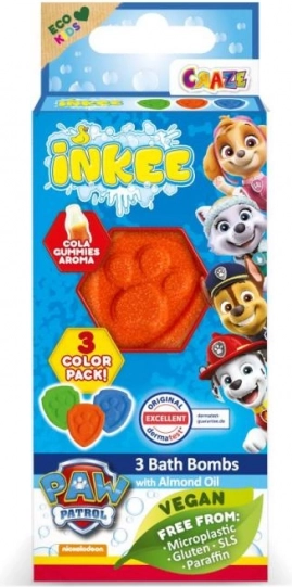 Bilele efervescente Inkee Paw Patrol transformă baia într-un joc colorat și parfumat. Fiecare mini bilă efervesc, colorează treptat apa și eliberează un parfum delicat pe placul copiilor. Datorită uleiului de migdale adăugat, ajută la înmuierea și catifelarea pielii.