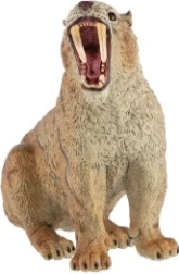 Gura deschisă și colții lungi evidențiază caracterul vânătorului preistoric. Blana texturată și coloritul natural oferă figurinei un aspect fidel.