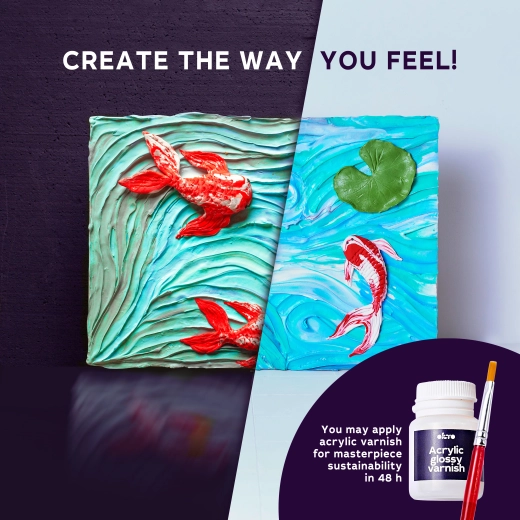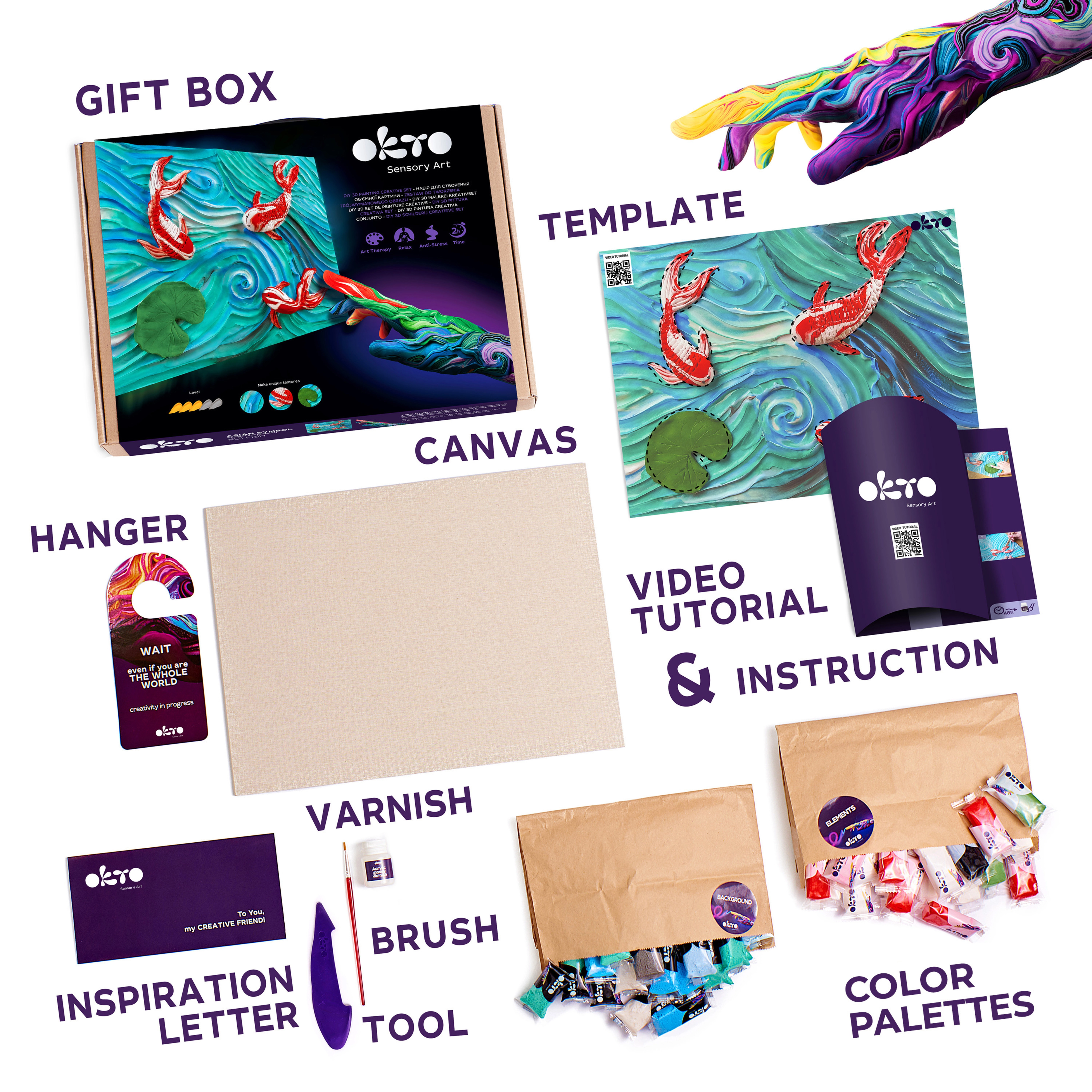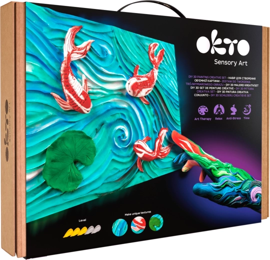 Acest set de artă vă permite să creați un tablou impresionant cu motivul Crapi koi pe o pânză naturală de calitate, de 30 × 40 cm. Datorită maselor de modelaj incluse și instrumentului de modelare din lemn, veți obține cu ușurință un efect 3D plastic care evidențiază detaliile și oferă lucrării un caracter unic.