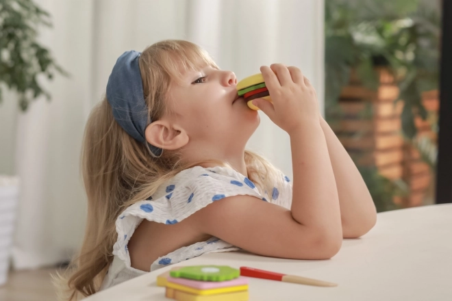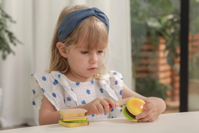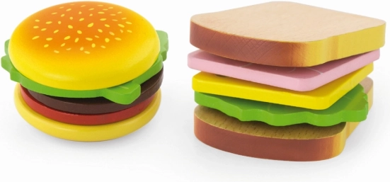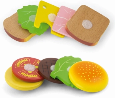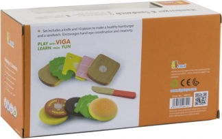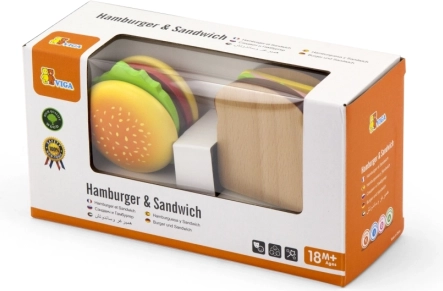Acest set de lemn de hamburger și sandviș de la VIGA este ideal pentru copiii mici care doresc să imite adulții în gătit. Componentele de lemn colorate și sigure, precum chiflele, salata, roșiile și brânza, permit joc nelimitat și creativitate. Jucăria ajută la dezvoltarea: