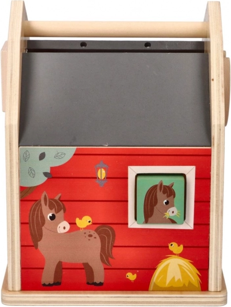 Căsuță colorată, cu două fețe, în formă de grajd, cu ilustrații drăguțe, concepută ca jucărie portabilă.