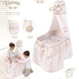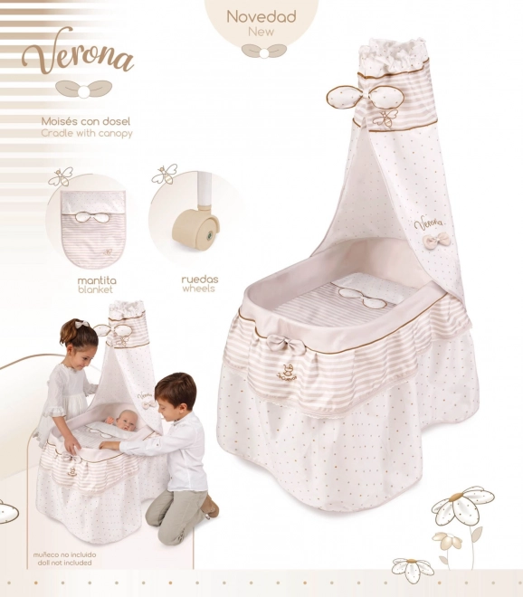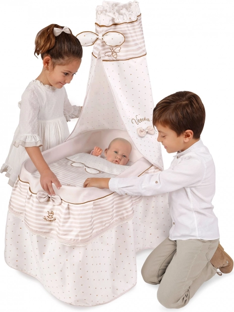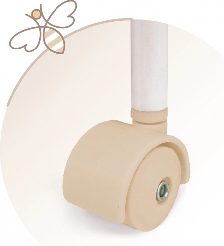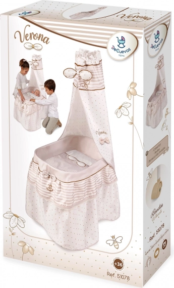 Acest pătuț stilat pentru păpuși este realizat în tonuri pastelate fine de bej și alb, cu buline și dungi discrete. Aspectul natural este completat de fundițe ce amintesc de petale și mici broderii cu albinuțe, care subliniază farmecul întregii colecții VERONA. Datorită roților pivotante, pătuțul poate fi mutat cu ușurință dintr-o cameră în alta, pentru ca micuța îngrijitoare să aibă mereu bebelușul aproape.