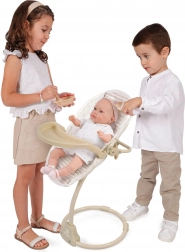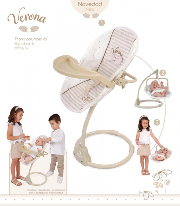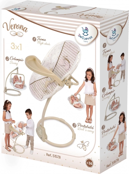 Acest scăunel multifuncțional și leagăn pentru păpuși 3 în 1 din colecția Verona oferă copiilor un joc realist și numeroase posibilități de îngrijire a bebelușului preferat. Combinația de bej deschis și alb, cu modele cu buline sau dungi, completată de tivuri discrete și aplicații cu fundițe, creează un aspect natural atemporal inspirat de designul spaniol.