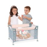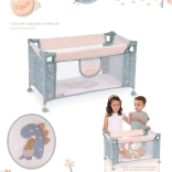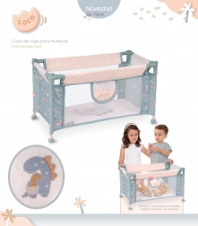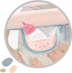 Pătuțul de călătorie pentru păpuși COCO este un accesoriu frumos pentru camera copilului și un ajutor practic în deplasări. Datorită cadrului solid din metal și plastic și laturilor textile cu plasă, este ușor, sigur și bine ventilat. Finisajul discret gri-albăstrui cu motivul puiului de dinozaur se potrivește cu celelalte accesorii ale colecției.