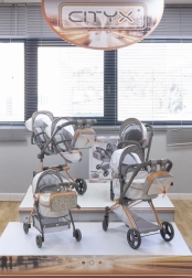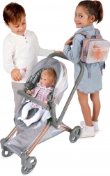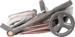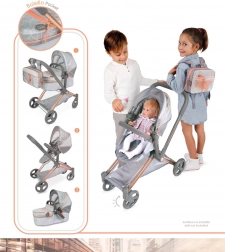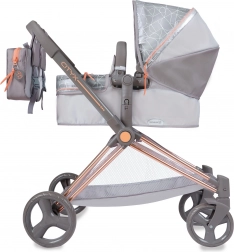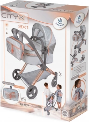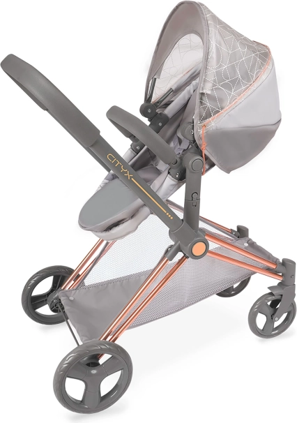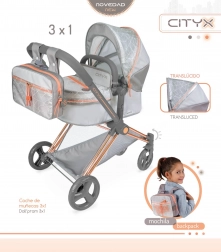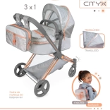 Căruciorul de joacă pentru păpuși 3 în 1 din colecția CITY X imită fidel cărucioarele moderne pentru copii. Combină textile de calitate cu PVC translucid cu efect de „sticlă” și accente elegante de cupru. Datorită landoului detașabil, ce poate fi montat cu fața sau cu spatele la direcția de mers, și posibilității de transformare în șezut sport, copiii se bucură de un joc realist și confortabil.
