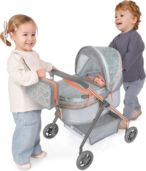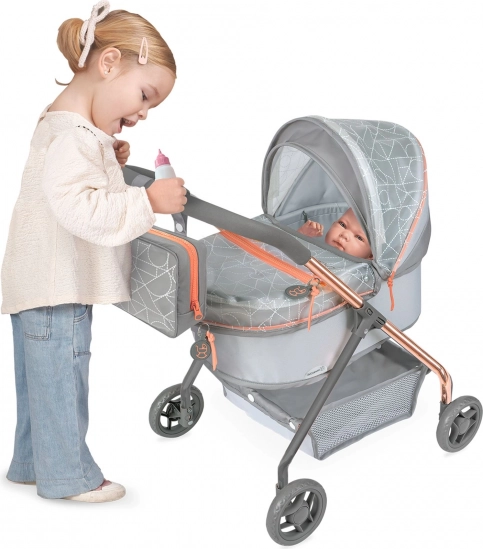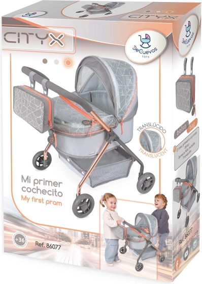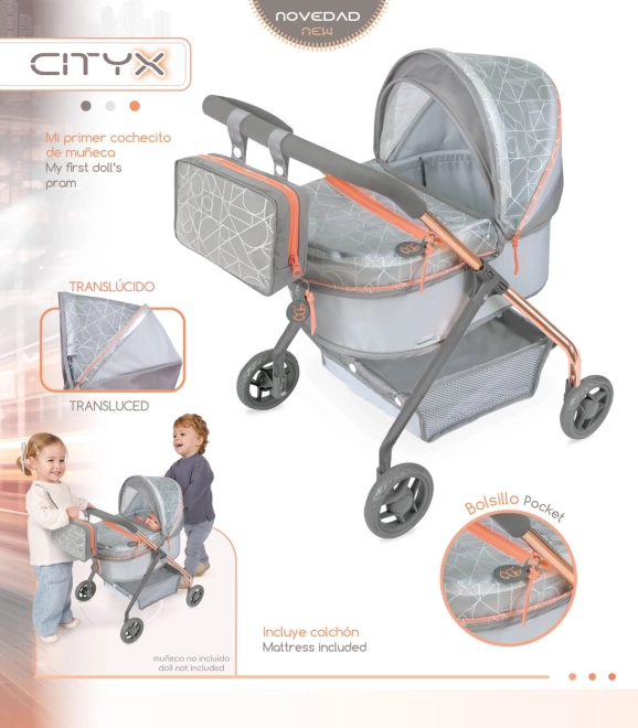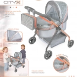 Colecția CITY X 2024 combină textile premium cu PVC decorativ imprimat, care creează efectul de suprafețe „din sticlă”. Finisajul elegant gri–argintiu este completat de elemente cuprate moderne, ce subliniază lejeritatea și aerisirea căruciorului. Datorită mânerului jos și șasiului stabil, căruciorul este ideal pentru fetițele foarte mici și perfect pentru jocuri de rol și dezvoltarea imaginației.