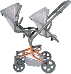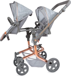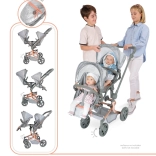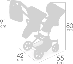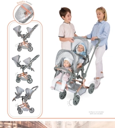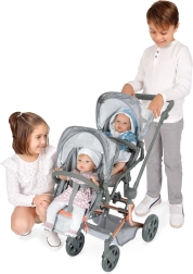 Căruciorul este o alegere excelentă pentru preșcolare: cele două landouri separate pot fi poziționate în sensul sau contra sensului de mers, păpușile pot fi asigurate cu centuri în 3 puncte, iar buzunarele transparente cu fermoar păstrează mărunțișurile. Mânerul reglabil pe înălțime (61–91 cm) crește odată cu copilul, iar roțile din față pivotante asigură o rulare lină.
