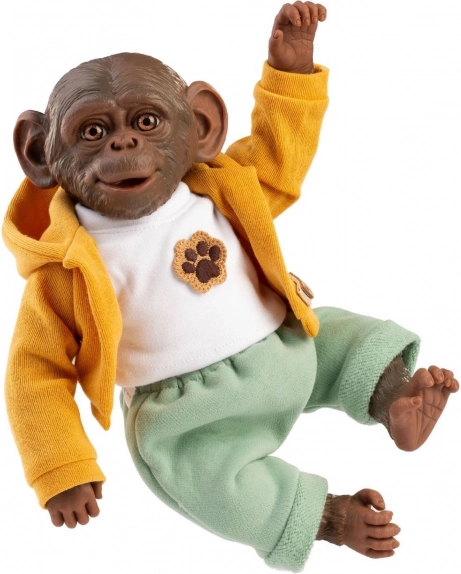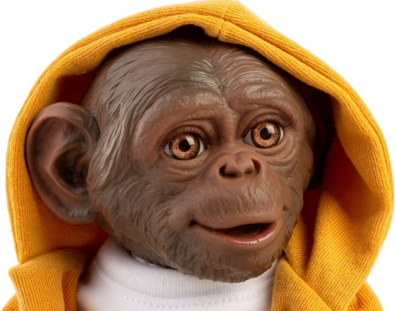 Maimuțica este îmbrăcată într-un pulover galben stilat și dispune de trăsături faciale realistice, care dau impresia unei maimuțe adevărate.