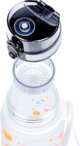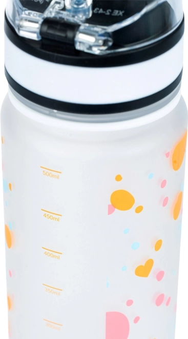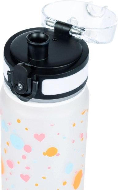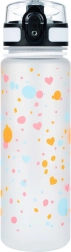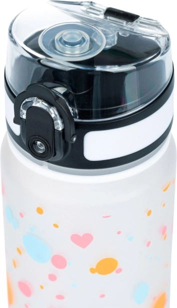 Sticlă stilată din tritan, cu volum de 500 ml și motiv cu inimioare, ideală pentru școală, sport și excursii. Oferă capac etanș cu închidere de siguranță, curea practică pentru purtare și filtru interior pentru fructe sau ceai. Fabricată din tritan sigur, fără BPA, fără miros și potrivită și pentru băuturi fierbinți.