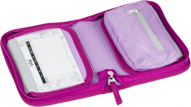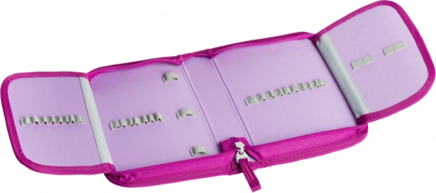 Partea frontală este decorată cu un motiv detaliat al unui unicorn în tonuri roz‑mov, care transformă penarul într-un accesoriu de școală de neconfundat.