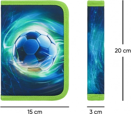 Partea frontală este decorată cu un motiv proeminent al unei mingi de fotbal, în combinație albastru-verde – o alegere excelentă pentru micii fotbaliști.
