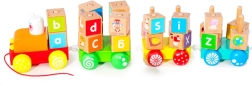 Trenul conține 26 de cuburi din lemn marcate cu litere mari și mici ale alfabetului și diferite imagini. Copiii pot construi cuvinte simple, turnuri sau le pot pune pe vagoane, iar când trenul se mișcă, cuburile încep să se învârtă în jurul axei lor, captând cu siguranță atenția fiecărui copil.