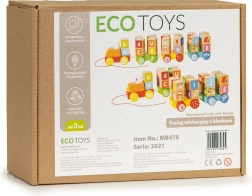 Trenul din lemn cu sfoară plin de cuburi colorate este conceput pentru scopuri educaționale. Ajută copiii să învețe literele și culorile și le dezvoltă creativitatea.