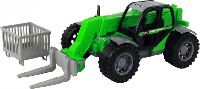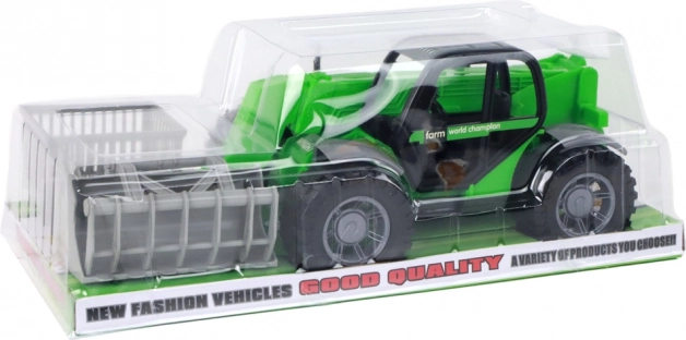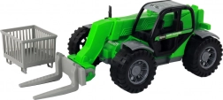 Pachetul include trei atașamente ușor de schimbat: furci pentru baloți și materiale, coș de transport și clește pentru lemn sau crengi. Mecanismul cu fricțiune permite punerea în mișcare simplă – doar împingeți și porniți. Joaca cu utilaje de construcții și agricole sprijină motricitatea fină, coordonarea și gândirea creativă.