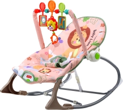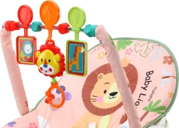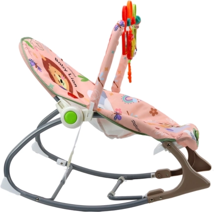 Leagănul este proiectat cu o husă textilă roz plăcută, decorată cu motivul unui leu drăguț și flori colorate. Partea leagănului include o jucărie colorată pe arc, care include animale suspendate precum leul și girafa și stimulează interacțiunea copilului.