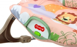 Leagănul este echipat cu o husă textilă roz cu motiv de leu și modele florale colorate, care atrag atenția fiecărui bebeluș.