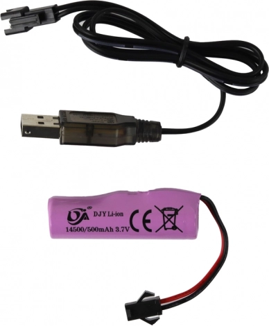 Mașina este alimentată de un acumulator Li-ion reîncărcabil de 3,7 V (500 mAh), pe care îl încarci cu cablul USB inclus. Telecomanda necesită 2× baterii AA de 1,5 V (neincluse). Produsul respectă standardele CE și EN71.