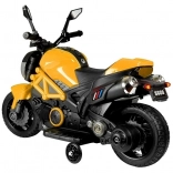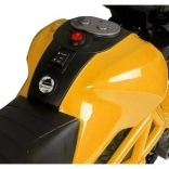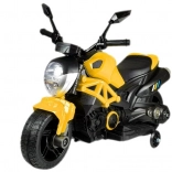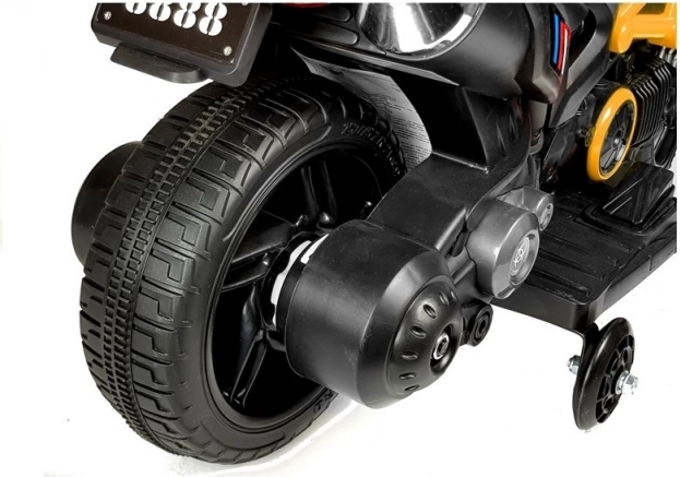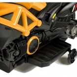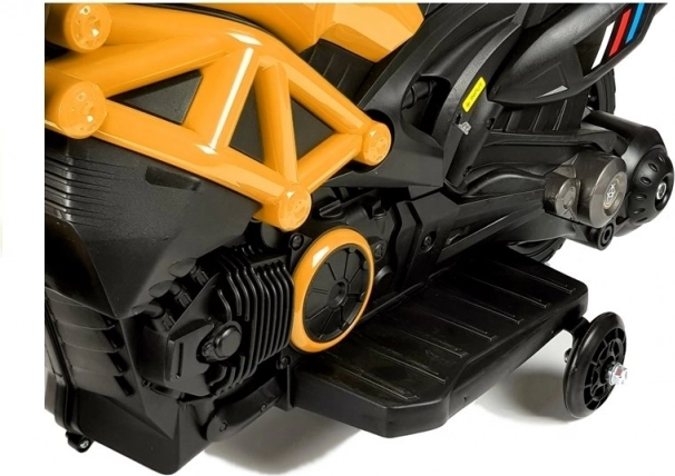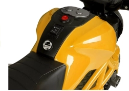 Motocicleta compactă pentru copii cu acumulator GTM1188 în culoarea galbenă oferă o deplasare stabilă, un aspect realist și o manevrare simplă. Are caroserie robustă, roți laterale de stabilizare integrate, marșarier și punct mort, precum și far LED frontal cu culori schimbătoare. Motorul silențios de 35 W antrenează roata din spate, iar motocicleta atinge până la 3 km/h. Ideală pentru copii de la 3 ani până la 25 kg, cu certificare CE pentru joacă în siguranță.