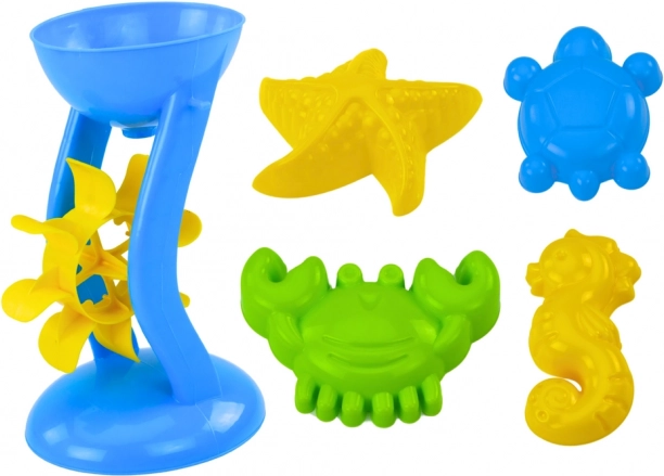 Setul include și o moară care poate fi folosită pentru transferul de nisip sau apă. Cu ajutorul lopățicii și greblei, micii constructori pot crea castele și tuneluri sau pot căuta comori ascunse. Cele patru forme marine în formă de căluț de mare, stea, crab și broască țestoasă adaugă creativitate și distracție.