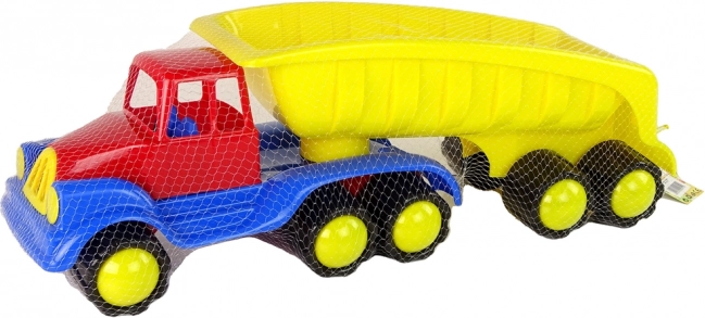 Marele camion galben cu remorcă este o jucărie care dezvoltă creativitatea și distracția copiilor. Datorită lungimii sale și remorcii rotative, permite o gamă largă de scenarii de joc.