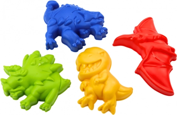 Patru forme colorate în formă de dinozauri stimulează imaginația și transformă orice lume de nisip într-o aventură preistorică.