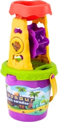 Totul într-un singur set: găleată cu moară, sită și pâlnie, lopățică, greblă, stropitoare și două forme pentru distracție fără sfârșit pe plajă și în groapa cu nisip.