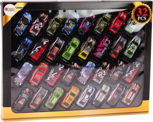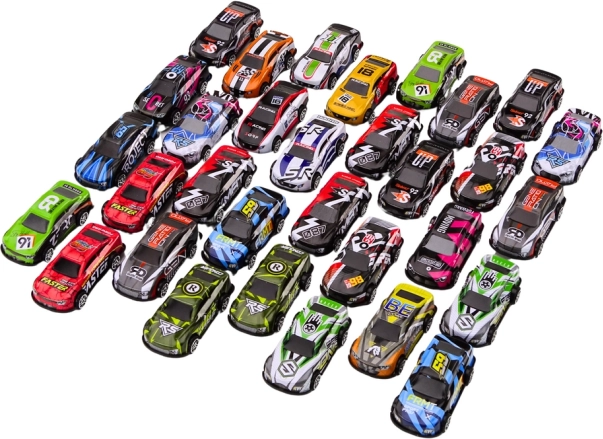 Această colecție bogată include 32 de mașinuțe unice în culori vii. Datorită mecanismului de rulare liberă, mașinuțele pornesc lin pe orice suprafață plană și invită la curse și scenarii de joc creative. Setul este ideal pentru circuite de acasă, raliuri improvizate și jocuri în grup.