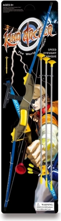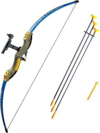 Setul include un arc impresionant, care măsoară 102 cm în lungime și este realizat în culori atractive de albastru cu accente galbene și aurii. Trei săgeți în combinație de culori gri-galben sunt terminate cu un vârf de cauciuc, ceea ce asigură utilizarea în siguranță și minimizează riscul de accidentare.