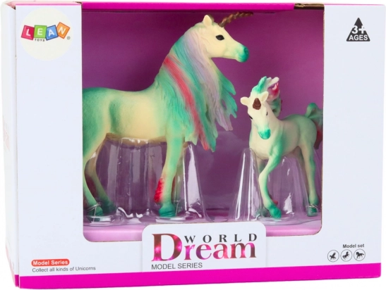 Acest set aduce o pereche de unicorni verzi – un adult modelat cu grijă și puiul său adorabil. Combinația dintre culoarea intensă a corpului și coama și coada viu colorate creează un aspect armonios, de basm, care atrage din prima clipă. Datorită detaliilor realiste, figurinele se remarcă atât în jocul copiilor, cât și în colecții.