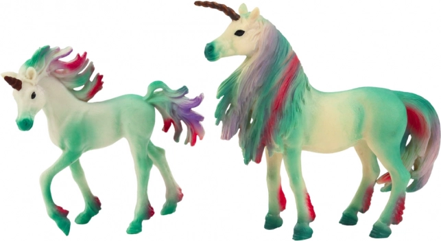 Set fermecător de 2 figurine cu unicorni – adult și pui – în elegantul verde, care va încânta orice fan mic sau mare al ființelor de basm. Detalii minuțioase, texturi realiste și coamă și coadă colorate oferă figurinelor un aer magic. Potrivite pentru joacă și ca decor în camera copiilor, realizate din material durabil, cu certificare CE și standard EN71.