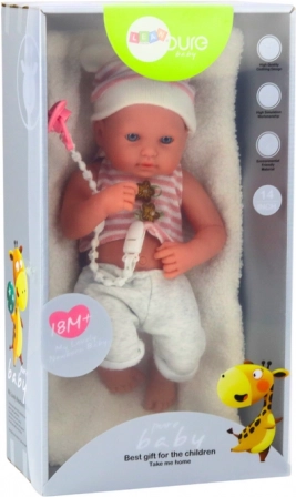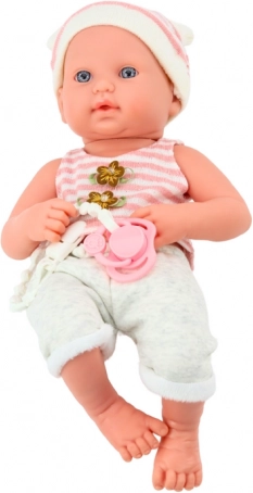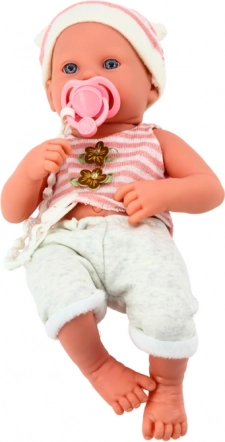 Drăgălașă păpușă bebeluș în hăinuță alb‑roz cu căciuliță, ideală pentru jocuri de îngrijire. Are trăsături faciale realiste, mâini și picioare mobile, iar setul include suzetă pe șnur și păturică moale. Realizare de calitate și sigură, potrivită de la 18 luni.