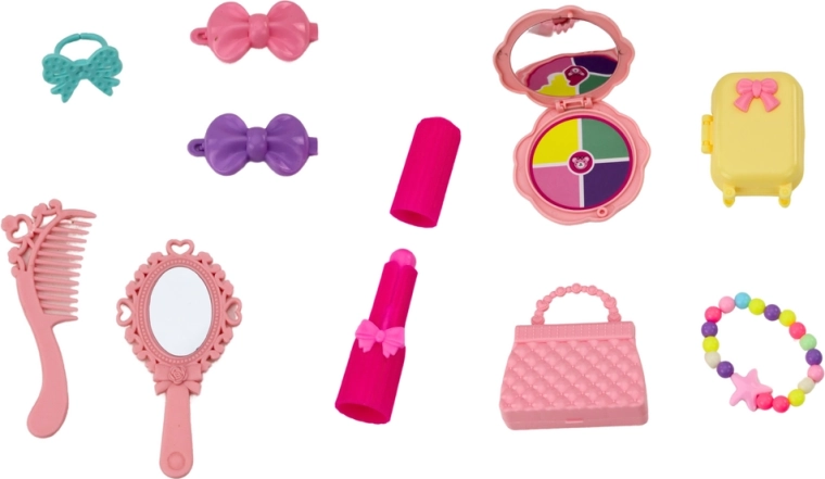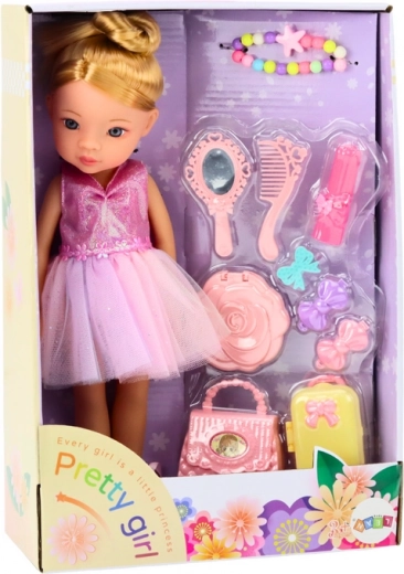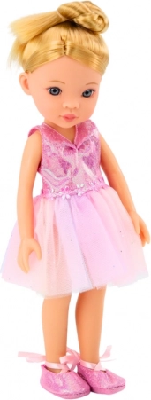 Păpușa este îmbrăcată într-o rochie elegantă de balet roz, sclipitoare și atrăgătoare. Poartă pe picioare balerini clasici legați în jurul gleznei, care îi oferă aspectul autentic al unei adevărate balerine. Păpușa are păr blond lung aranjat într-un coc înalt, care îi accentuează stilul de balet. Are un machiaj fin și un colier colorat, care îi conferă farmec și eleganță. Setul include o poșetă stilată, ideală pentru micile ei accesorii. Un troller funcțional pe care păpușa îl poate lua în călătoriile sale de balet. Agrafe de păr care pot fi folosite pentru aranjarea coafurii păpușii. Un ineluș care îi adaugă o notă de eleganță. O oglindă, o perie și o oglindă de mână, datorită cărora păpușa își poate verifica aspectul înainte de spectacolul de balet.